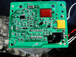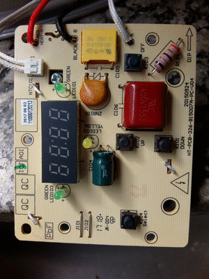 Estimados colegas la foto que ven es el circuito de una olla eléctrica Crockpot Type SC53 Modelo SCCPVC605-S-A de 120 volts 240 w y que fuera lamentablemente alimentada con 220 volts. No se ha encontrado fusible a la vista (?). La resistencia principal se encuentra bien, midiéndose 60 ohms. La resistencia de arriba a la derecha, que entiendo es de 34 ohms, estaba volada. El capacitor amarillo, entre los cables negro y blanco de alimentación (110 v) esta bueno. Pegado al cable negro se aprecia las tres patas de un triac que aparentemente esta bien.