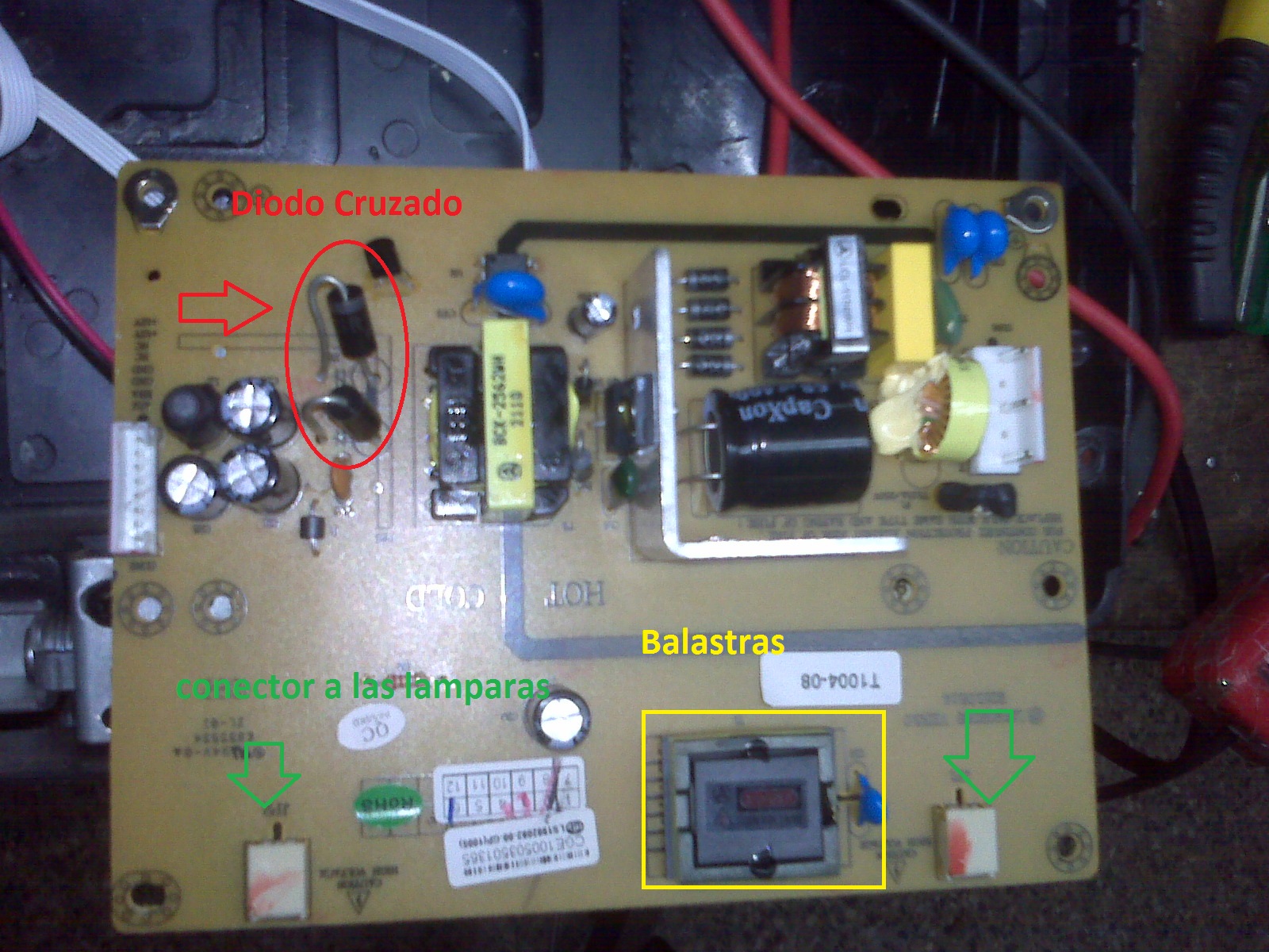 revisaste el mosfet de la fuente? porque si dices en la foto que un diodo estaba cruzado... lo mas probable es que el mosfet esté en corto o abierto.
