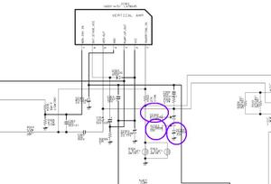 Al desconectar los resistores R303: 1,2Ω 2W y R304: 1,5Ω 2W se consigue abrir el circuito que conecta la salida del amplificador vertical con la sección vertical del yugo y el trayecto de la señal que circula por ella hacia tierra (masa), por esta razón ya no calienta el fusistor de 1Ω 1W...En condiciones normales de funcionamiento la seeción vertical del yugo no debería presentar tensión continua (D.C o C.C), verificar si esto condición se cumple asimismo verificar que no se encuentre con "fuga" y/o "corto" alguno de los diodos zener: DZ302, DZ303, DZ306 conectados entre el pin 5: VERT OUT y tierra, hacer lo mismo con el capacitor C306: 104/100V (MP)